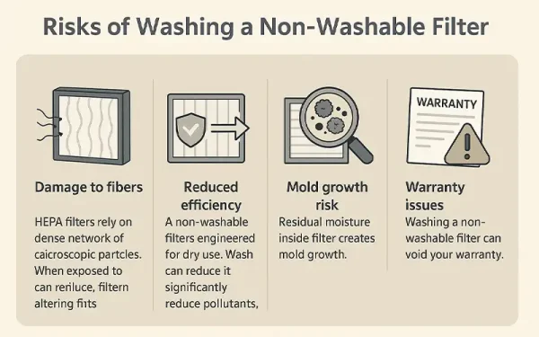 Sebbene lavare un vero filtro HEPA lavabile possa essere conveniente, la sicurezza dovrebbe essere un fattore primario nella decisione. Una pulizia impropria di un filtro lavabile o il lavaggio accidentale di un filtro non lavabile può portare a: