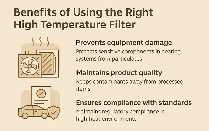 I filtri per alte temperature proteggono i componenti sensibili degli impianti di riscaldamento, dei condotti e dei ventilatori da polvere, cenere e altre particelle che possono accumularsi in condizioni di calore estremo. Prevenendo l’accumulo e l’abrasione, questi filtri prolungano la durata dei macchinari e riducono i costosi tempi di fermo.
