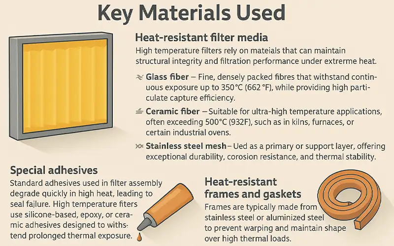 I filtri ad alta temperatura utilizzano materiali che mantengono struttura e prestazioni sotto calore estremo. I mezzi comuni includono:
