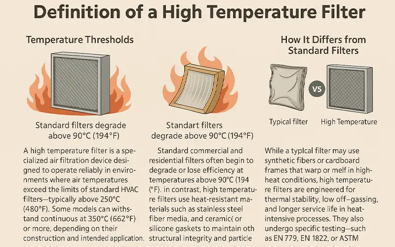 Un filtro ad alta temperatura è un dispositivo specializzato di filtrazione dell’aria progettato per operare in ambienti dove le temperature superano i limiti dei normali filtri HVAC – tipicamente oltre 250°C (480°F).
